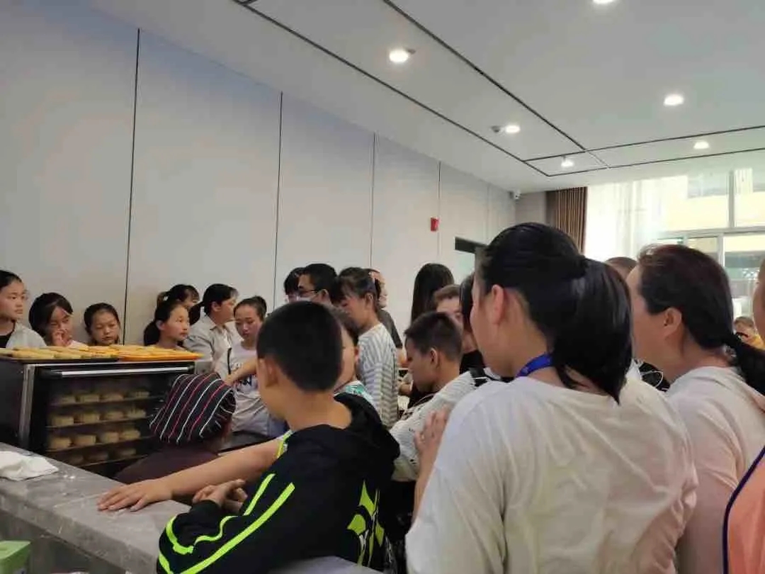 小朋友們排隊(duì)領(lǐng)取制作月餅的材料和模具