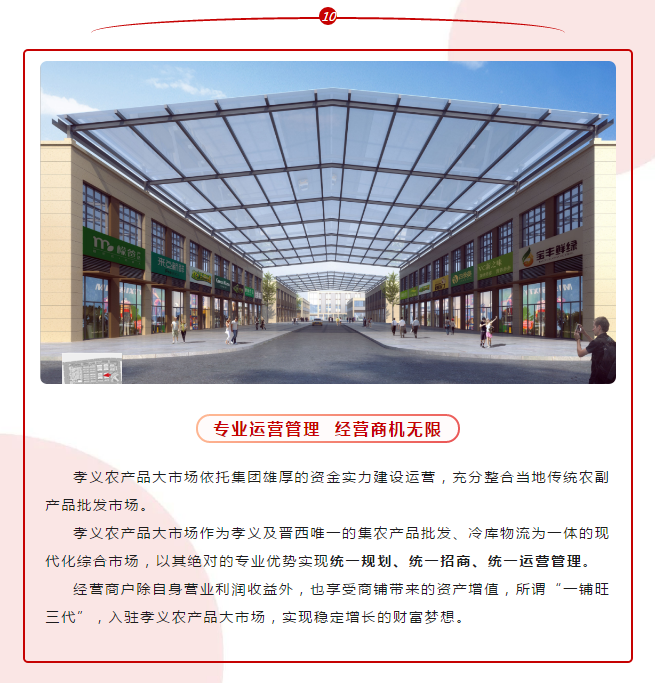 孝義農(nóng)產(chǎn)品大市場(chǎng)現(xiàn)已成為孝義市首屈一指的財(cái)富孵化搖籃,投資低、回報(bào)快,滿足所有經(jīng)營(yíng)戶的購(gòu)鋪需求,既適合商戶經(jīng)營(yíng),又適合商家發(fā)展。