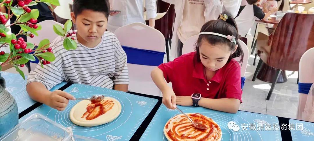 接下來披薩教學(xué)課程正式開始!食材擺上來之后,在場的小朋友興致盎然、躍躍欲試。全程小朋友們獨立自主完成,廚師指導(dǎo)。場面溫馨有趣,孩子們認真仔細,不少小朋友還在互相交流心得。