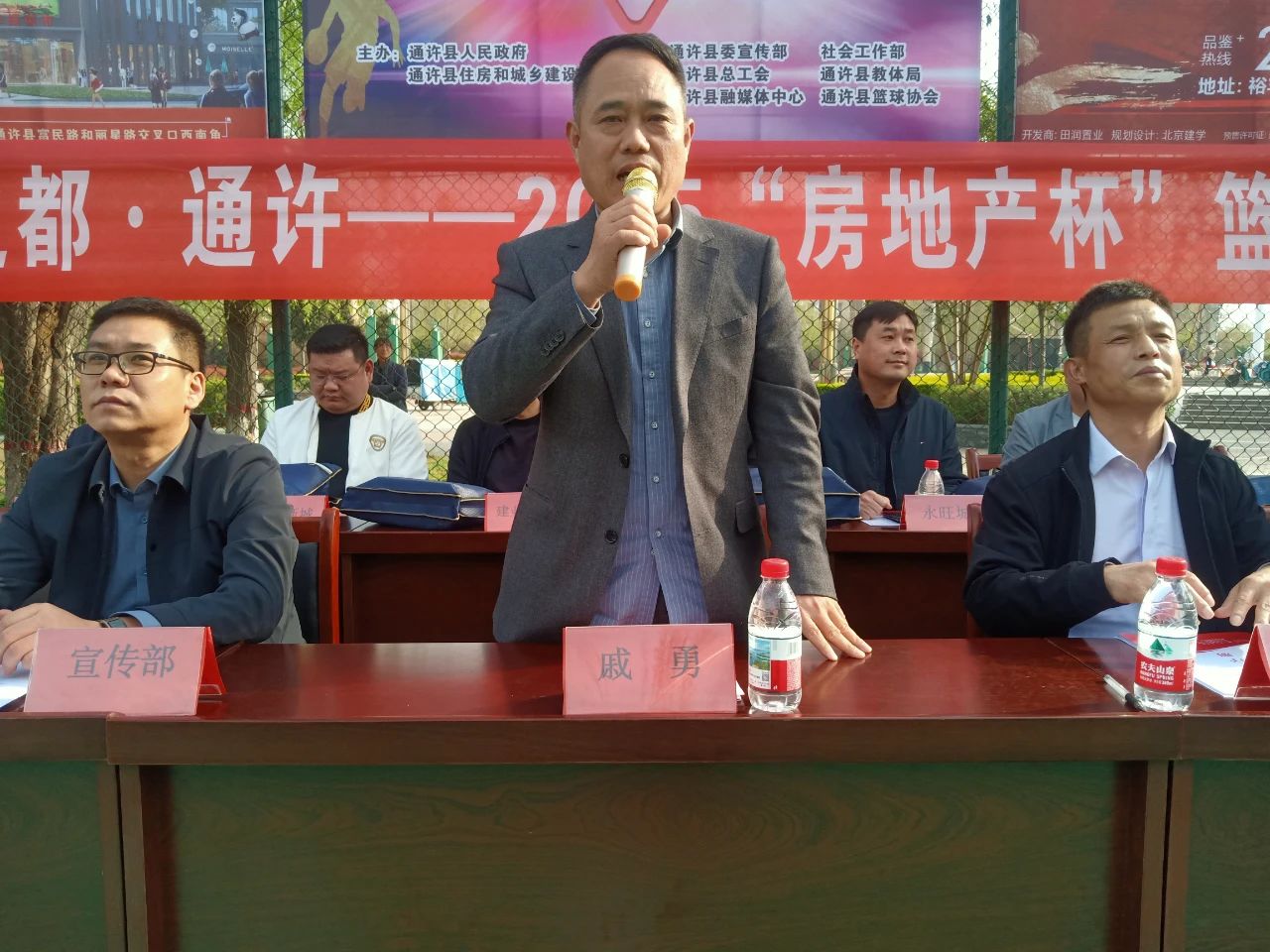 開封市住房和城鄉(xiāng)建設(shè)局黨組成員、副局長(zhǎng)戚勇宣布通許縣首屆中國(guó)酸辣粉之都·通許—2025 “房地產(chǎn)杯”籃球賽開幕。