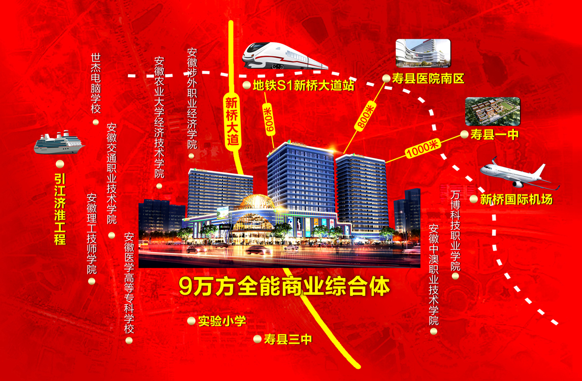 項目位于新橋大道與陽光大道交匯處,傲居新橋最中心區(qū)域。項目傾力打造新橋首席9萬方全能綜合體,無縫融入合肥半小時都市圈,距離4E級合肥新橋國際機(jī)場8公里,合肥-新橋機(jī)場-六安城際高鐵、合肥地鐵S1號線(2025年通車)均于新橋產(chǎn)業(yè)園設(shè)經(jīng)停站(地鐵站距離本項目約800米),江淮運河穿境而過,兩千噸級新橋貨運港區(qū)近在咫尺。周邊學(xué)區(qū)(壽縣一中、實驗小學(xué))林立,八所大學(xué)城環(huán)繞,壽縣醫(yī)院也定址項目北約1公里。齊全的配套環(huán)境帶來無限的人氣和發(fā)展機(jī)遇。