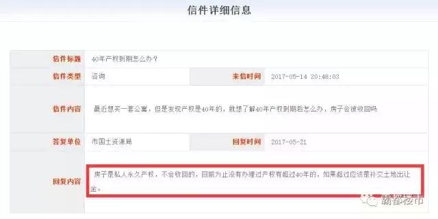 今天,在合肥12345上,合肥市國土資源局回復(fù)有關(guān)“40年公寓產(chǎn)權(quán)到期”的問題,表示:產(chǎn)權(quán)到期,房子不會收回。