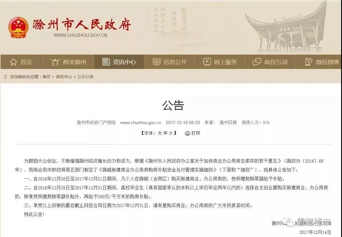 01 自2016年12月28日至2017年12月31日期間,凡個(gè)人在滁城(含兩區(qū))購買新建商業(yè)、辦公用房的,按所繳契稅等額給予補(bǔ)貼。