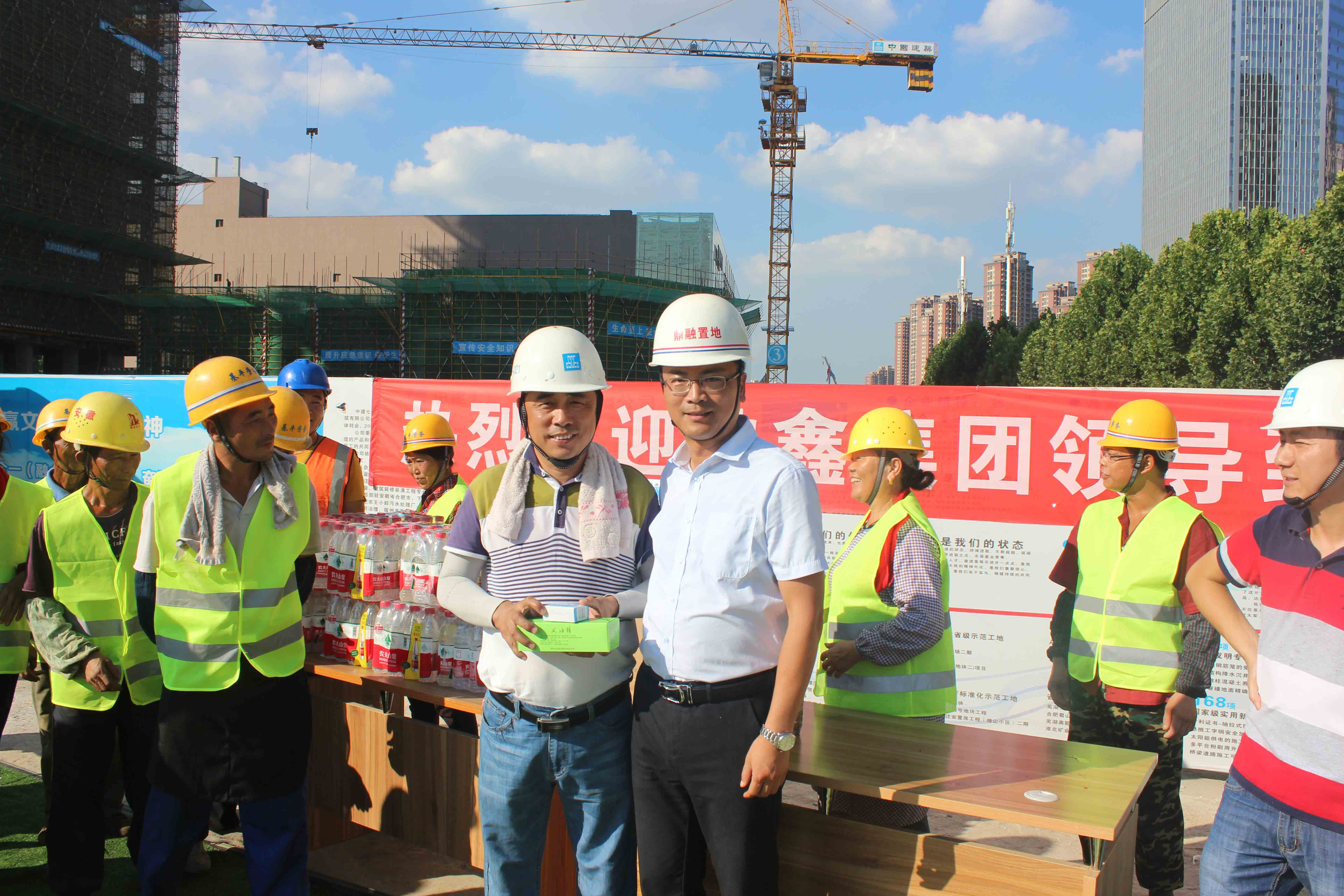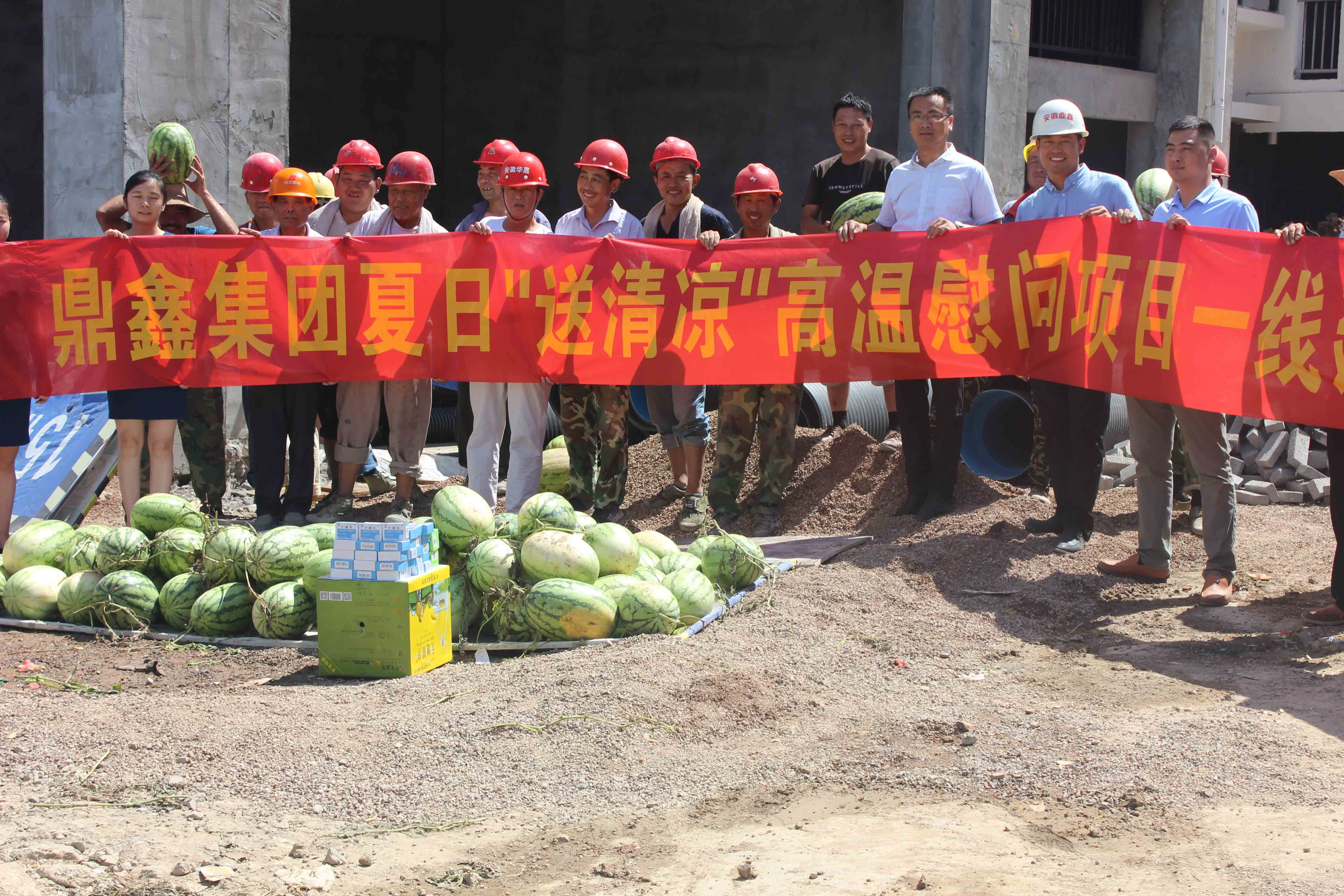 2018年7月18日,安徽鼎鑫集團(tuán)總裁張曉東先生、行政部朱雪梅女士、項目部汪承金、谷趁意先生等一行,攜帶西瓜、礦泉水、風(fēng)油精、藿香正氣水等防暑降溫食品、藥物,前往集團(tuán)在建項目【鼎鑫·幸福城】、【鼎鑫·空港企業(yè)園】和【鼎鑫中心】項目,慰問項目工地的全體員工。